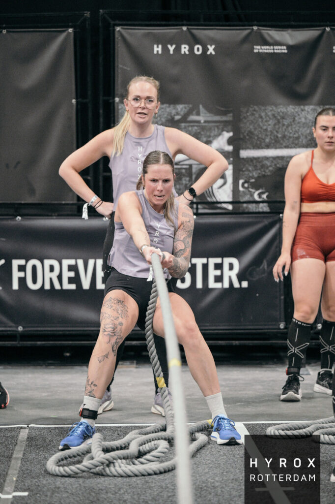 De sfeer tijdens een Hyrox-event is echt iets bijzonders. Het is competitief, maar ook motiverend en gezellig. Iedereen moedigt elkaar aan en je stapt gegarandeerd met een trots gevoel de hal weer uit.